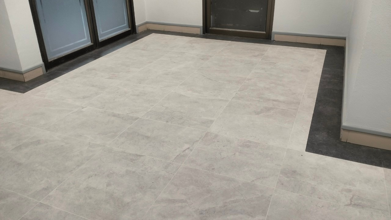 หลังจากเข้าสำรวจพื้นที่จริง ทีมงานได้วางแผนงานปูพื้นใหม่ โดยเริ่มจากการรื้อพื้นเก่า, ปรับระดับพื้นที่ให้สม่ำเสมอ และลงน้ำยารองพื้นเพื่อกันชื้นในระยะยาว จากนั้นจึงเริ่มขั้นตอนการปูกระเบื้องใหม่ด้วยลวดลายที่เจ้าของบ้านเลือกเอง เป็นกระเบื้องลายโทนอุ่น ขนาดยาวแบบร่วมสมัย เพื่อให้ได้อารมณ์อบอุ่น แต่คงทนและดูแลรักษาง่ายกว่ามาก